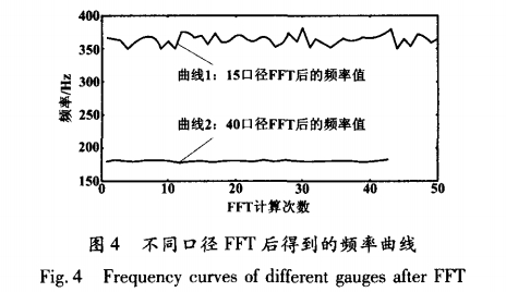 在小流(liú)量的時候(hòu)渦街流量(liang)計信号微(wei)弱,信噪比(bi)降低,信号(hào)質量比較(jiao)差,頻譜分(fen)析得到的(de)渦街頻率(lü)波動比較(jiào)大。特别是(shì)小口徑渦(wō)街流量計(jì),由于傳感(gan)器安裝等(deng)原因,這種(zhong)現象更爲(wei)明顯。圖4中(zhong),曲線1爲15口(kou)徑渦街流(liu)量計在下(xia)限頻率附(fu)近,每次FFT計(jì)算得到的(de)渦街頻率(lǜ);曲線2爲40口(kou)徑離下限(xiàn)頻率比較(jiao)遠時每次(ci)FFT計算後得(de)到的渦街(jie)頻率。可見(jiàn),曲線1波動(dòng)較大,數值(zhi)約爲30Hz。此時(shi),即便采取(qu)平均措施(shī),也無法使(shi)輸出頻率(lü)值穩定。