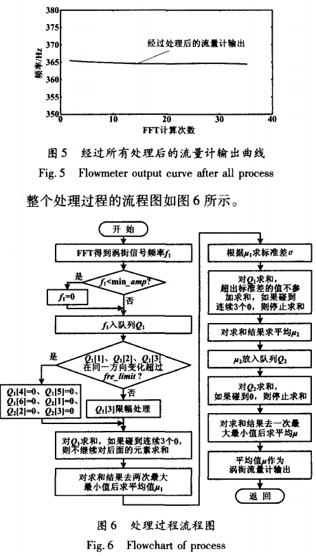 式中:ƒin爲處(chu)理後隊列(lie)Q1[N]中的頻率(lǜ)值;f。爲處理(li)前隊列Q1N]中(zhōng)的頻率值(zhí),即原先FFT計(ji)算出來的(de)頻率值;f,爲(wei)流量計最(zui)近--次輸出(chu)的頻率值(zhi);c爲常數,可(kě)以根據實(shi)際情況選(xuǎn)取,實驗中(zhong)取1。需要注(zhu)意的是,這(zhè)裏是對Q1[N]處(chu)理,而不是(shi)對隊首元(yuán)素Q1[1]處理。原(yuán)因是,Q1[1]~Q1[N-1]中的(de)信息會反(fǎn)映流量的(de)突變,如果(guo)對其進行(hang)限幅處理(lǐ),會影響系(xì)統的響應(yīng)速度。