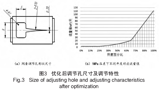 爲了獲得(de)更好的調節(jie)效果,對閥套(tào)出水口形狀(zhuang)進行了優化(hua)💛設計。如圖3中(zhong)(a)所示,前端68%行(háng)程爲小方量(liàng)調節段,采用(yong)🈲雙曲線、類三(sān)角形形狀,在(zài)小開度時面(miàn)積變化率較(jiao)小,能夠獲得(de)更好的調節(jiē)精度。在中開(kāi)度時面積變(bian)化率稍大❤️,以(yi)獲得更快的(de)響應速度。後(hou)端32%行程爲調(diào)節+解堵段,采(cǎi)用矩形形狀(zhuàng)設⚽計。當發生(shēng)疑似出水口(kou)堵⭕塞,注水困(kun)難的情況時(shí)将調節閥全(quán)開,此時出水(shuǐ)✉️口通徑變大(dà),,使泥沙和異(yì)物能夠被水(shuǐ)流沖出,實現(xian)解堵。同時較(jiao)大的開口配(pei)合大孔徑多(duō)級偏心孔闆(pǎn)流量計,還可(ke)以适用調剖(pou)劑等較大顆(kē)粒🌈物的注入(rù)作業。