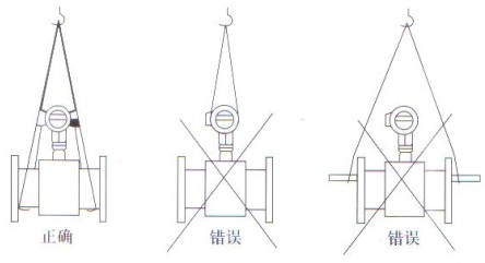 在搬運(yùn)和吊裝傳感器時(shí),應該将吊索套在(zai)傳感器兩端頸部(bu)位置或吊環上,切(qie)勿在測量管内套(tào)入管棒進行吊裝(zhuang),以免損壞襯裏(見(jiàn)圖)。在吊裝和搬運(yun)電磁流量計過程(chéng)中,必須防止傳感(gǎn)器襯裏和接線盒(hé)🌐受碰撞而損壞。
