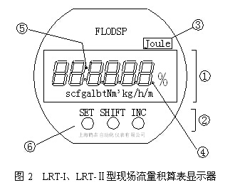 LRT-I、LRT-Ⅱ型氣體渦(wō)輪流量計現(xian)場流量積算(suan)表顯示器各(ge)部分說明見(jian)圖2和表1。