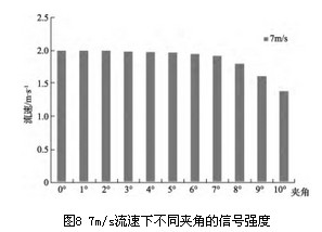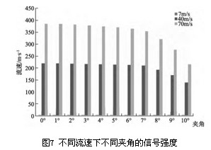将表(biao)2的數據繪制(zhì)成圖7,将圖7中(zhōng)流速爲7m/s的數(shù)據放大如👣圖(tú)㊙️8所示。觀察圖(tu)7、8,可以直觀的(de)反應出夾角(jiao)、流速與信号(hao)強度的關系(xi)變化。通過對(dui)比這3張圖可(kě)以看出,信号(hao)強度随着夾(jiá)角、流速的不(bu)同而不同。并(bìng)從圖中得出(chu)結論💃🏻:
