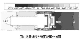 以流量(liàng)Q=250m3/h的數值(zhi)模拟計(jì)算結果(guǒ)爲例進(jin)行渦輪(lún)流量計(ji)内部流(liu)場⛱️及壓(yā)力場的(de)分析.圖(tú)5爲渦輪(lun)流量計(ji)軸⁉️向剖(pou)面靜壓(yā)分布圖(tu).前導流(liú)器前後(hou)的壓力(li)場分布(bu)♈較均勻(yún)且壓力(lì)梯度較(jiao)小,在機(jī)芯殼體(ti)與葉輪(lún)支座連(lián)接凸台(tái)處壓力(lì)有所增(zeng)加,連接(jiē)面後壓(ya)力又逐(zhú)漸減小(xiao).故認爲(wei)流體流(liú)經葉輪(lún)支座産(chan)生壓力(lì)損失的(de)主要原(yuán)因是連(lian)⚽接處存(cun)在凸台(tái),導緻流(liú)場出現(xiàn)較大變(bian)化,不能(neng)平滑過(guo)㊙️渡,建議(yì)将葉輪(lun)支座與(yu)機芯殼(ke)體的❄️連(lián)接改爲(wèi)圓弧線(xiàn)型或流(liu)線型。