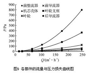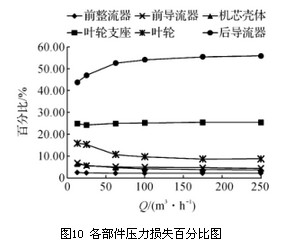 2)分(fen)析各部(bu)件對壓(ya)力損失(shī)的影響(xiang),其壓力(li)損失與(yǔ)流量成(cheng)二次函(hán)數關系(xi)。後導流(liú)器相對(dui)于其他(ta)部件是(shi)壓力損(sǔn)失的主(zhǔ)要因素(sù),約占總(zong)壓力損(sun)失的一(yī)半,随🍓着(zhe)流量的(de)增加其(qí)壓力🙇♀️損(sǔn)失占🈚總(zǒng)壓力損(sun)失的比(bǐ)例上升(sheng)了12.15%。葉輪(lún)支座的(de)壓力損(sun)失約占(zhan)總壓力(li)損失的(de)🧑🏾🤝🧑🏼1/4,其壓力(li)損失比(bi)例随流(liú)量的增(zeng)加基本(běn)不變。随(sui)着流量(liàng)的增加(jia)葉✊輪産(chan)生的壓(yā)力損失(shī)比例降(jiàng)幅明顯(xian)。