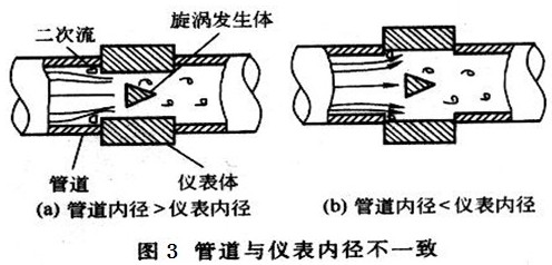 而(ér)渦街流量計(ji)與安裝管道(dao)内徑也會存(cún)在誤差,或大(dà)或✂️小,如圖3所(suǒ)示,當被測介(jie)質經過時,也(yě)會發生二次(cì)流動,對測量(liàng)結果産生🚶♀️波(bo)動影響。
