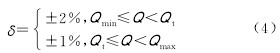 式中:δ爲(wei)計量相對(dui)誤差;Qmax爲工(gōng)況最大流(liu)量,m3/h;Qmin爲工況(kuàng)最小🚩流量(liàng)✌️,m3/h;Qt爲分界流(liú)量點,其值(zhi)等于 20%Qmax,m3/h。
