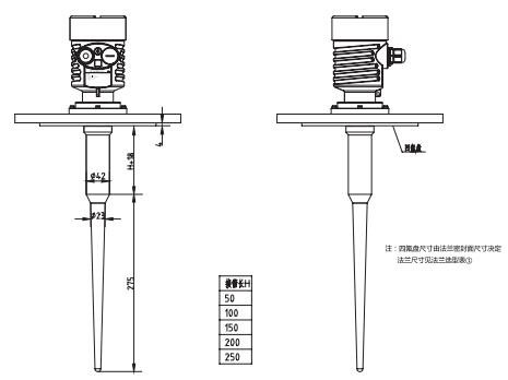 簡(jian)介 SKD52防腐棒式雷達(dá)物位計 傳感器是(shì)雷達式物位測量(liàng)儀表測量距離最(zuì)大35米,可以🔞用于🌈存(cun)♌儲罐、中間緩沖罐(guàn)或過程容器的物(wù)位👈測量,輸出4~20mA疊加(jia)HART信号。 輸入 防腐棒(bang)式雷達物位計天(tian)線接收反射的微(wei)波脈沖并将其傳(chuán)輸給電子線路,微(wēi)處理器對此信号(hao)進行處理,識别出(chū)微脈沖在物料表(biao)面所産生的回波(bō)。正🥰确的回波信号(hao)識别由智能軟件(jiàn)完成,精度可達毫(hao)米級。距離物料表(biǎo)面的距離D與脈沖(chòng)的時間行程T成正(zheng)比:D=C×T/2(其中C爲光速) 因(yīn)空罐的距離E已知(zhī),則物位L爲:L=E-D 輸出 通(tōng)過輸入空罐高度(dù)E(=零點),滿罐高度F(=滿(mǎn)量程)及一些應用(yòng)參👄數來設定,應用(yong)參數将自動使儀(yí)表适應測👌量環境(jìng)。對應于4~20mA輸出。 SKD52防腐(fǔ)棒式雷達物位計(ji)參數 應用:存儲或(huo)過程容器腐蝕性(xing)的液體漿料、固體(tǐ)比如:污水儲罐、酸(suan)堿儲罐、漿料儲罐(guàn),固體顆粒,小型儲(chu)油罐 測量範圍:20米(mi) 過程連接:PTFE翻邊法(fa)蘭 介質溫度:-40~120℃ 過程(chéng)壓力:-0.1~1.6Mpa 精度:±10mm 頻率範(fàn)圍:6GHz 防爆等級:Exb IIBT4 Gb 防護(hù)等級:IP67 信号輸出:4~20mA/HART(兩(liǎng)線/四線) SKD52防腐棒式(shì)雷達物位計外型(xíng)尺寸圖 SKD52防腐棒式(shi)雷達物位計安裝(zhuang) SKD52防腐棒式雷達物(wù)位計選型