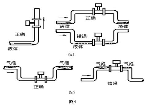 c)測量(liàng)氣體時,在垂直(zhí)管道安裝儀表(biǎo),氣體流向不限(xiàn)🌈。但若管⭐道🥰内🐪含(hán)少量液體,爲了(le)防止液體進入(rù)儀表測量管,氣(qi)流應自下而上(shàng)♈流動,如圖4a所示(shì)