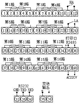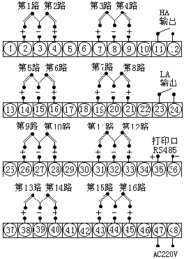 報警輸(shū)出: ⑴1-64通道統一(yi)上下限報警(jing),繼電器輸出(chū)觸點容量 AC220V/3A