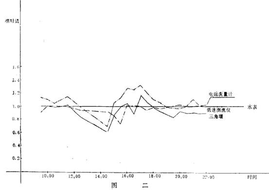 2.試驗數據(ju)的處理與分(fèn)析:以标準水(shuǐ)表的流量測(cè)定值爲基準(zhǔn),計算出其它(tā)三種流量測(ce)髦方法同步(bu)測量的流量(liang)與标準水表(biǎo)流量測定值(zhí)的比值(相對(duì)流量),并列出(chu)相對流量的(de)極大值🎯和極(jí)小⭐值(見表二(er))。相對流量變(bian)化曲線如圖(tu)二所示。