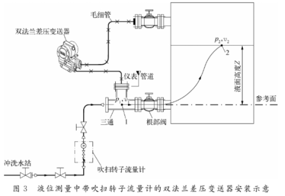 煤氣(qi)化裝置中液體(ti)吹掃的典型應(ying)用是差壓法測(ce)量氣👨❤️👨化爐🆚激🚶冷(lěng)室液位。由于氣(qi)化爐激冷室内(nei)的激冷水爲複(fú)雜混合物,既含(hán)有易堵塞的固(gù)體顆粒.物,也含(han)有腐蝕性成分(fen),因此一般📞采用(yong)雙法蘭差壓變(bian)送器進行測量(liàng)。變送器負壓側(ce)法蘭隔膜與激(jī)冷室内的氣相(xiang)接觸,無需吹掃(sǎo),而變送器正壓(yā)側法蘭隔📧膜則(ze)與激冷水接觸(chu),必須引入沖洗(xǐ)水以防止取壓(ya)口堵塞影響液(yè)位測量,并延長(zhang)變送器的壽命(mìng)。帶吹掃轉子流(liú)量計的雙法蘭(lán)差壓變送器安(an)裝如圖3所🈲示。
