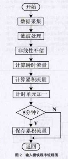 輸(shū)入模塊主(zhu)要包括數(shu)據采集、濾(lü)波、溫度補(bu)償、非線性(xìng)補償和數(shù)值計算等(děng),總體采用(yòng)定時器中(zhōng)斷方式✨,程(chéng)序✏️流程圖(tu)如圖2所示(shi)。輸♋入模塊(kuai)中的非線(xiàn)性補償程(cheng)序采用分(fèn)段線性拟(ni)合的方式(shì)來實現。通(tong)過采集㊙️9組(zu)或11組流量(liang)信号,作爲(wei)拟合直線(xian)的端點,當(dang)前采樣㊙️值(zhí)按數據大(dà)小得到拟(nǐ)合曲線段(duan)的斜率和(hé)初始數據(ju),代入拟合(he)方程即可(ke)得到修正(zhèng)後的流量(liang)數據。
